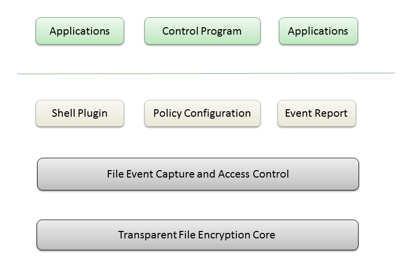 ETEFS_Mini includes a file access control module and an operation event monitor module. The file access control module is used to restrict the operation on the currently opened file issued by the user according to the access control policy. The operation event monitor is used to capture the user’s action on the encrypted file, such as “file opened” and “file closed” event, etc.